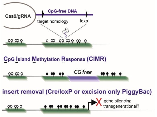 - Tompkins, J. Engineering Pluripotent Cpg Island DNA Methylation by Cpg Island Methylation Response (Cimr) to Synthetic Cpg-Free Ssdna Insertion. Cell Rep. Methods 2023, 3, 100465. [Google Scholar] [CrossRef]