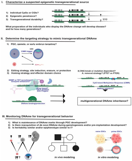A basic framework for determining whether programmed DNAme is transgenerational has been provided. Major considerations for editing are provided as follows. (I) Characterize the source of transgenerational detriment, epigenetic penetrance, and the expected generational durability. Which DNAme sites are changed relative to normal, age, and sex-matched controls without exposure? What proportion of individuals with a particular heritable DNAme exhibit the negative epiphenotype? How many generations of transgenerational inheritance may be expected? For strongly modeled candidates or those supported by long-term epidemiological studies on transgenerational inheritance, epigenetic editing for mimicry can be used to test the suspected site for programmed transgenerational effects. Closed circles represent methylated candidate CG sites, which can be found in clusters or individually. (II) Determine the targeting strategy to mimic transgenerational DNAme. Targeting of PGCs, gametes, or early embryonic windows is preferred for inheritance into entire organisms, and for targeting developmental windows, which precede next-generation PGC migration and development for inheritance testing. Editing strategies are generally protein-homing-based and may also include certain adaptations to the enzymatically dead Cas systems, such as crRNA modifications and effector domain scaffolds. Specific domains or small RNA co-factors active during key developmental windows may enhance these activities towards transgenerational outcomes, especially those building histone marks, such as H3K9me3, which promote eventual DNAme deposition during later stages of development. Demethylation strategies generally rely on the recruitment of active demethylating enzymes or activating domains, such as VP64, to override DNAme. Engineered DNAme sites may also be protected by binding certain factors, such as STELLA, to prevent first-generation removal and allow for durability testing in subsequent generations. Insertions of CpG-free DNA or mutations that drive changes in transcription, for example, may induce local CGI DNAme spreading epimutations. Retained after the original insult, these naturally aid in transgenerational testing. (III) Monitor DNAme for transgenerational inheritance. Programmable Transgenerational Epigenetic Reacquisition (PTER) is the intentional, locus-, or region-specific induction of specific epigenetic configurations, which fail to escape germline or pre-implantation erasure but that are retriggered with each ensuing generation without the continued presence of epigenetic editing systems. This is unique from Programmable Transgenerational Epigenetic Transmission (PTET), which involves protection from germline and pre-implantation stages of epigenetic erasure. Either form of inheritance is of interest to human biology, but these remain important mechanistic clarifications, which can be further defined by stage-specific isolation of developing PGCs and gametes, developing blastocysts, and the examination of multigenerational inheritance in somatic tissues of offspring. Pedigree analyses can aid in establishing transgenerational transmission, penetrance, and durability. For in vitro modeling, which may include human pluripotent stem cells, the reversible cycling of cells between primed and naïve states enables reversible global DNAme switching and the testing of DNAme between additional generations of development. Sites or regions that wane in DNAme over repeat cycling, especially with DNAme-inducing DNA or mutations removed, are less likely to maintain transgenerational activity in vivo. For human early embryo studies modeled in vitro, the 14-day rule would be sufficient for understanding DNAme inheritance through primed stages of pluripotency and up to gastrulation. Beyond this, in vitro mimics of specific human somatic lineages remain state-of-the-art. Given the difference between humans and mice in repetitive element and imprinting regulation, human studies are preferred for human biology; however, preclinical modeling remains essential to understanding and testing transgenerational DNAme correction.