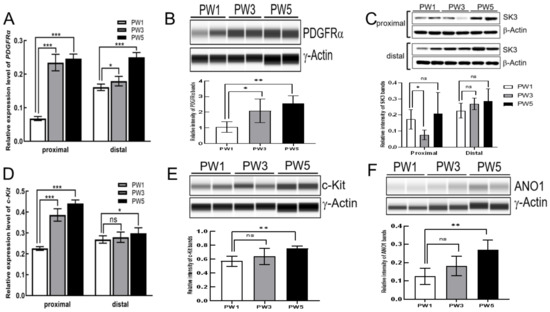 The expression of representative interstitial cell genes. (A): The result of quantitative real-time PCR of Pdgfra mRNA levels in the proximal colon (n = 4) and the distal colon (n = 4) of PW1, PW3, and PW5 samples. (B): Wes analysis of PDGFRα protein in the proximal colon of the three samples. (C): The result of immunoblotting of SK3 protein in the proximal colon and the distal colon of the three samples. (D): The result of quantitative real-time PCR of c-Kit mRNA levels in the proximal colon (n = 4) and the distal colon (n = 4). (E,F): Wes analysis of c-Kit and ANO1 proteins in the proximal colon (n = 4). The bar graphs shown in (A,B), and (D–F) represent mean ± SD (n = 4). “n” means the number of animals. Gapdh and b-ACTIN or g-ACTIN were used as reference in qRT-PCR and immunoblotting assays, respectively. Samples were compared using unpaired t-test. * p < 0.05; ** p < 0.01; *** p < 0.001; ns, no significant difference. Original images of (B,C,E,F) can be found in Supplementary Materials.