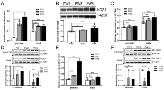 The expression of representative genes in inhibitory neurons and excitatory neurons. (A,C,E): The result of quantitative real-time PCR of Nos1, P2ry1, and Slc18a3 mRNA levels in PW1, PW3, and PW5 of the proximal colon (n = 4) and the distal colon (n = 4) of each period. (B): Wes analysis of NOS1 protein in the proximal colon of the three samples. (D,F): The result of immunoblotting of P2ry1 and Slc18a3 proteins in the proximal colon and the distal colon of the three samples. The bar graphs shown in (A–C,E) represent mean ± SD (n = 4). “n” means the number of animals. Gapdh and β-ACTIN or γ-ACTIN were used as reference in qRT-PCR and immunoblotting assays, respectively. Samples were compared using unpaired t-test. * p < 0.05; ** p < 0.01; *** p < 0.001; ns, no significant difference. Original images of (B,D,F) can be found in Supplementary Materials.