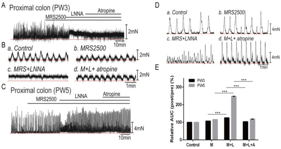 To further investigate the fundamental mechanism of colonic motility regulated by ENS, CMC assays were performed on the entire colon of PW1, PW3, and PW5 mice with the application of MRS2500, LNNA, and atropine. In PW1 mice, the proximal colon showed a high frequency of spontaneous contraction without propulsive migratory movement, and the middle and distal colon displayed CMC activities (Figure 6A). However, PW3 and PW5 mice generated CMC activities (Figure 6B,C). The CMC patterns displayed higher amplitudes and frequencies in the proximal, middle, and distal colons of PW3 and PW5 mice compared to PW1 mice (Figure 6D,E). These data suggest that CMCs developed higher amplitudes and lower frequencies as a function of age.