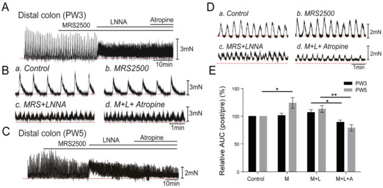 In smooth muscle strips from the distal colon, MRS2500 (1 µM) had no obvious effects on the spontaneous contractions from PW3 mice (n = 6, Figure 5A,B,E) but significantly increased the AUC to 124.1 ± 0.10% in PW5 mice (p < 0.05, Figure 5C–E). Subsequent treatment with LNNA (100 µM) did not show a further increase in the AUC of the distal colon in PW3 (107.1 ± 0.05%) and PW5 (113.2 ± 0.06%) compared to those of MRS2500 treatment (Figure 5E). Atropine significantly inhibited the effect of MRS2500 and LNNA responses in the distal colon in PW3 mice (p < 0.05) and in PW5 mice (p < 0.01) (Figure 5E).