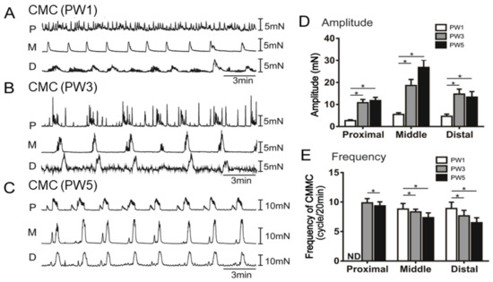 The colonic motor complexes of various colon sections in young mice. (A–C): The contraction features of isolated proximal colon (P), middle colon (M), and distal colon (D) under normal conditions in PW1 (A), PW3 (B), and PW5 (C) mice. (D): The quantified CMC frequency of each colon segment in PW1, PW3, and PW5 mice. (E): The quantified CMC amplitude of each colon segment in PW1, PW3, and PW5 mice. The bar graphs shown in panels (D,E) represent mean ± SE (n = 15). “n” means the number of animals. * p < 0.05.