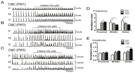 The excitatory effects of the nitrergic neuron blocker LNNA on CMC in the young murine colon. (A–C): The contraction features of isolated proximal (P), middle (M), and distal colon (D) treated with LNNA (100.0 µM) from PW1 (A), PW3 (B), and PW5 mice (C). (D): The CMC frequency of each colon section treated with LNNA from PW1, PW3, and PW5 mice (n = 6). ND represent not determined. (E): The CMC amplitude of each colon section treated with 100.0 µM LNNA from PW1, PW3, and PW5 mice (n = 6). “n” means the number of animals. The bar graphs shown in panel D and E represent mean ± SE. * p < 0.05.