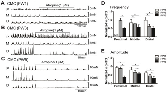 We also tested the development of cholinergic neurons, which play an excitatory role on colonic motility through ICCs. Treatment with atropine (1 µM) had no significant effect on the frequency and amplitude of CMCs in PW1 middle and distal colons (Figure 8A,D,E). PW3 mice showed different responses to atropine from the proximal to the distal colon (Figure 8B,D,E). However, atropine significantly repressed the frequency and amplitude of CMCs in PW5 mice (Figure 8C–E).