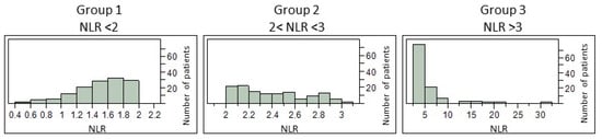 Focusing our study, especially on neutrophil/lymphocyte ratio (NLR), we distributed patients in 3 groups depending on their NLR at diagnosis: group 1 with baseline NLR values < 2 (n = 127); group 2 with NLR values [2,3] (n = 122); and group 3 with NLR values > 3 (n = 110). The distribution of NLR values within each group is presented in Figure 1. A comparison of their demographic and clinical characteristics is detailed in Table 1. We highlighted a significant difference in the ALSFRS-r score between each group (p = 0.0010). A deeper comparison using the Wilcoxon test for each pair of groups revealed a significant difference between groups 1 and 2 vs. group 3 (p = 0.0019 and p = 0.0008, respectively) and no significant difference between groups 1 and 2 (p = 0.5379). As expected, significant differences between the three groups were found for white blood cells (neutrophils, eosinophils, lymphocytes, and monocytes), NLR, and NMR. Patients of Group 3 had significantly higher levels of leucocytes, neutrophils, NLR, and NMR, but lower levels of eosinophils, basophils, lymphocytes, and monocytes (Table 1). For the rest of the analyses, the 3 groups were compared separately.