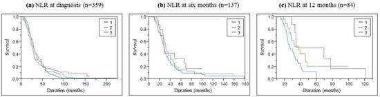 Kaplan–Meier analysis presented in Figure 2 showed that the survival time was different among the three NLR groups. We performed pairwise log-rank tests to evaluate the difference between groups. At inclusion, close but significantly different curves were found between groups 1 and 3 (p = 0.0399). The pairwise test at six months did not highlight a significant difference, but we can see a trend of better survival in group 1 with lower NLR values. After one year, we observed that group 3 with NLR > 3 quickly decreased while group 1 stepping decreased, and group 2 stayed between. This observation was confirmed by a significant difference between the curves of groups 1 and 3 (p = 0.0126) and between groups 2 and 3 (p = 0.0342). Survival medians according to the NLR group were presented in Table 2.