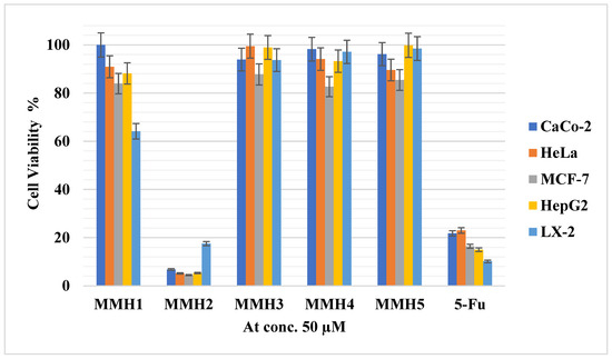 All of the thiazole derivatives’ cytotoxicity was investigated using cultured cell lines, including HepG2, MCF-7, HeLa, CaCo-2, cancer cell lines, and the normal hepatic cell line LX-2, which were grown separately in RPMI-1640 media (Sigma, Norwich, UK). The media were supplemented with 1% L-glutamine (Sigma, London, UK), 1% penicillin/streptomycin antibiotics (BI, New Delhi, India), and 10% fetal bovine serum. These cells were cultured under humid conditions with 5% CO2 at 37 °C. In 96-well plates, cells were seeded at a density of 2.6 × 104 cells per well. After 48 h, cancer cells were exposed to thiazole derivatives (MMH1-5) at one concentration (50 µM) for 24 h. Cell viability was assessed using the CellTiter 96® Aqueous One Solution Cell Proliferation (MTS) Assay from Promega Corporation, Madison, WI, USA, following the manufacturer’s instructions. Following the treatment, 20 µL of MTS solution was added to each well containing 100 µL of medium, and the plates with thiazole derivatives were incubated at 37 °C for 2 h. Absorbance was measured at 490 nm [36,37].