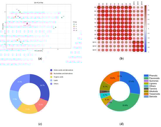 To comprehend the general metabolic variations and variability between groups among the samples, Principal Component Analysis (PCA) was carried out on the specimens, including the QC samples. PCA determines whether there are variations among metabolomes by separating metabolome trends into groups. Insignificant differences were found between UV-B pressure treatment specimens of the same materials in PCA of the control, experimental, and QC samples; however, there was a clear pattern of segregation between the various groups (Figure 1a). The Pearson correlation coefficient (PCC) R was employed as an evaluation metric for the correlation of the three biological replicates. Heat maps of the correlation between the three biological replicates and the QC samples were also created. The data showed a strong positive association among the three biological replicates (Figure 1b).