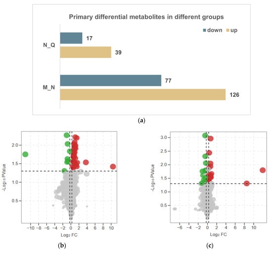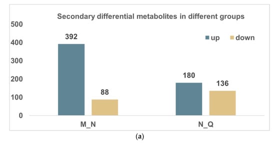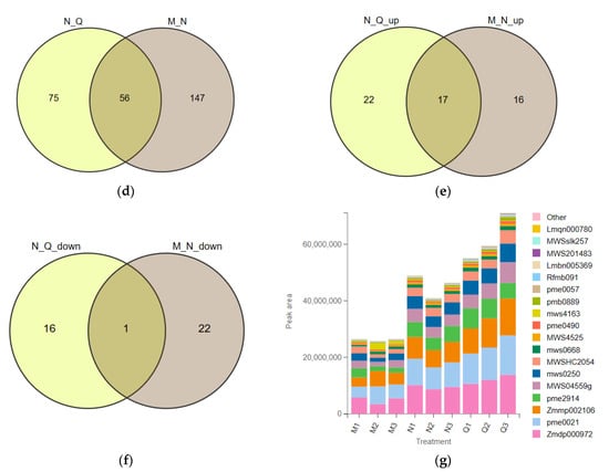 Analysis of the primary DMs in R. chrysanthum following UV-B exposure and UV-B exposure with externally administered ABA. (a) Statistic differences in metabolites across groups; (b,c) DMs of the M−N and N−Q groups are displayed on volcano plots, respectively. In the volcano plot, red circles represent up-regulated substances and green circles represent down-regulated substances, horizontal dashed lines indicate screening p < 0.05, vertical dashed lines screening |fold change| > 1.2; (d–f) Venn diagrams for DMs, upregulated DMs, and downregulated DMs are shown for the M−N and N−Q groups, respectively; (g) The three MNQ groups’ core DMs are shown in bar graphs.