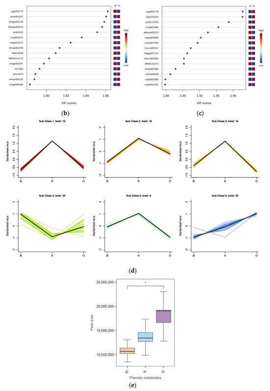 The screening parameters for secondary metabolites matched those for primary metabolites. The MN group of secondary metabolites had a total of 392 DMs that were upregulated and 88 which were downregulated, while the NQ group had 180 DMs that were upregulated and 136 that were downregulated (Figure 3a). According to the VIP value, Figure 3b,c show the first 15 metabolites were up- and downregulated in the MN group and the NQ group, respectively. In addition, following UV-B stress and ABA addition, cluster analysis revealed three distinct metabolite trends (Figure 3d). Naturally, we focused more on the sixth cluster. There, we discovered that the DMs that were clustered to the sixth cluster showed a growing trend in the MN group, indicating that these metabolites are crucial in the response to UV-B stress, and continued to show an upward trend in the NQ group, showing that the outwardly applied ABA helps the R. chrysanthum to withstand UV-B stress. The majority of the secondary DMs in cluster VI are phenolic substances. As a result, we suggest that variations in phenolic content may help to improve the fluidity of membranes and promote the protective effects of reactive oxygen species (ROS) when exposed to UV-B stress. There were statistical differences between groups in the quantity of phenolic chemicals (Figure 3e). It was discovered that R. chrysanthum was able to withstand UV-B stress thanks to the external application of ABA, which also caused phenolic abundance to grow greatly following UV-B stress.