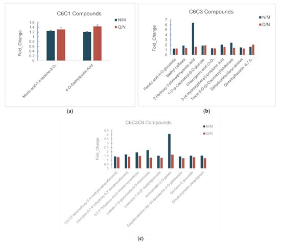 The ratio of the phenolic content in R. chrysanthum after UV-B radiation only to the phenolic content in R. chrysanthum without UV-B radiation as well as the ratio of the phenolic content in R. chrysanthum after UV-B radiation with externally applied ABA to the phenolic content in R. chrysanthum after UV-B radiation with no ABA applied were greater than one (Figure 4a–c). In other words, phenolics contribute to R. chrysanthum’s ability to fend off UV-B harm. The plant’s ability to withstand UV-B stress was also improved by the effective promotion of stomatal closure by ABA when administered externally. Additionally, the abundance changes of all C6C3C6 backbone phenolics were less pronounced in the MN group than in the NQ group, indicating that this group of phenolics likely contributes significantly to R. chrysanthum’s UV-B protection (Figure 4c).