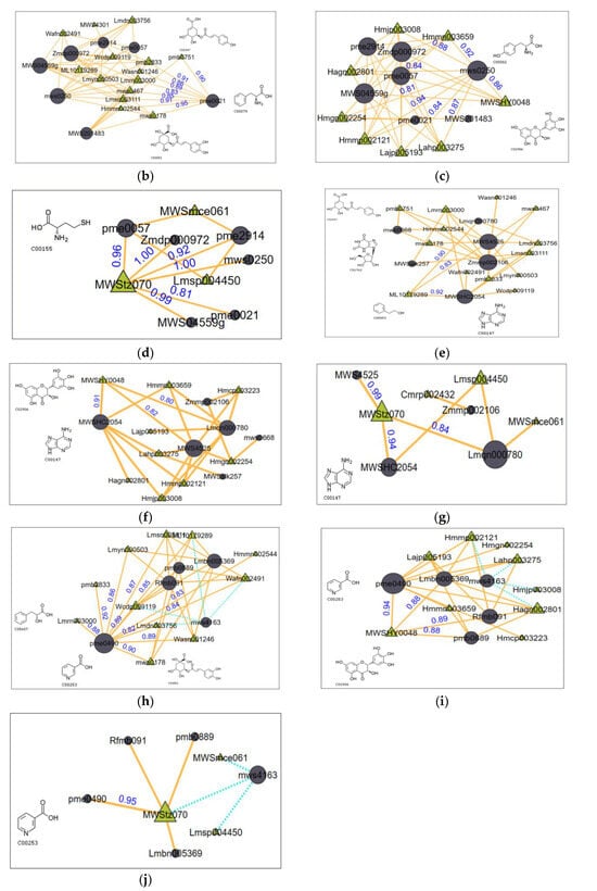 Again, only 25 positive correlations and no negative correlations were found in the correlation analysis of nucleotides and their derivatives with phenolic acids (Figure 5e). For instance, with correlation values of 0.92 and 0.88, respectively, adenine strongly positively linked with 2-phenylethanol, and xanthosine significantly positively associated with Trans-5-O-(p-Coumaroyl) shikimate. Only 22 positive correlations between nucleotides and their derivatives and flavonoids were found in the correlation study (Figure 5f). For instance, adenine and dihydromyricetin (ampelopsin) had a correlation of 0.91, which was significantly positive. In addition, 6-O-methylguanine and dihydromyricetin (ampelopsin) exhibited positive correlations with adenine and 13(S)-HODE, respectively. There were only seven positive connections and no negative correlations in the correlation study of nucleotides and their derivatives with lignans, alkaloids, and terpenoids (Figure 5g). For instance, adenine and N-(2-hydroxy-4-methoxyphenyl) acetamide had a correlation coefficient of 0.94 that was significantly positive. Combining the results of the three correlation analyses, it was discovered that nucleotides and their derivatives had the strongest link with phenolic acids and interacted with the most compounds, followed by flavonoids.