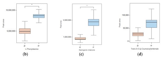 Metabolomics is a rapidly developing field that plays a critical role in understanding the complicated primary and secondary metabolite variations in higher plants []. Modern biology is increasingly adopting and recognizing metabolomics techniques. Nuclear magnetic resonance spectroscopy (NMR), gas chromatography–mass spectrometry (GC-MS), and liquid chromatography–mass spectrometry (LC-MS) are typical analytical methods used in plant metabolomics research [,]. Due to recent advancements in UPLC-MS techniques, which offer greater and fewer run durations than traditional HPLC-MS techniques, metabolite analysis has become more reliable []. UV-B stabilizes health-promoting bioactive chemicals that are necessary for the bread-making process []. Additionally, the analysis of flavonoids using ultra-high-performance liquid chromatography revealed that UVR8-mediated flavonoid induction is a UV-B tolerance feature that is conserved in terrestrial plants and could be an early adaptation to life on Earth [].
