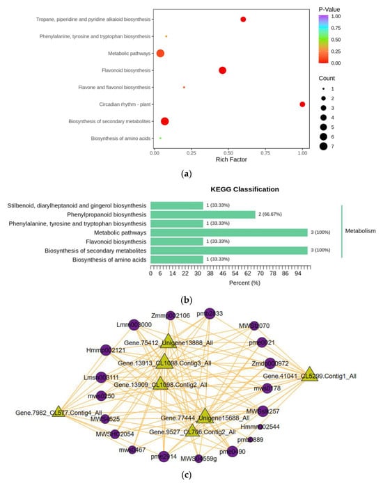 Key enzymes involved in R. chrysanthum’s reaction to UV-B exposure were analyzed using the KEGG pathway method, and correlations between key enzymes and metabolites were examined. (a,b) Key enzymes’ KEGG bubble and bar graphs; (c) links between proteins and metabolomes. Proteins are represented by triangles, metabolites by circles, and positive relationships by solid yellow lines.