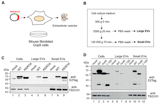 - Reinsalu, O.; Samel, A.; Niemeister, E.; Kurg, R. MAGEA4 Coated Extracellular Vesicles Are Stable and Can Be Assembled in Vitro. Int. J. Mol. Sci. 2021, 22, 5208. [Google Scholar] [CrossRef]