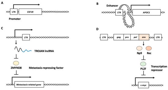 LTRs can act as promoter/enhancer elements to modulate the expression of surrounding genes. For example, the malignant Hodgkin/Reed–Sternberg (HRS) cells of Hodgkin’s B-cell lymphoma aberrantly express the transcript of CSF1R, a receptor for colony-stimulating factor 1, from an LTR (THE1B) located 6.2 kb upstream of the normal myeloid transcription start site [,]. The prominent demethylation of CpG elements was found in the LTR region upstream CSF1R in several of Hodgkin’s lymphoma cell lines, suggesting that epigenetic alterations activate the LTR promoter activity for aberrant CSF1R expression (Figure 2A) []. Six ERV families (LTR2B, LTR2C, LTR5B, LTR5_Hs, LTR12C, and LTR13A) with acute myeloid leukemia (AML)-associated enhancer chromatin signatures are enriched in the binding sites of key regulators of hematopoiesis and AML pathogenesis []. An LTR2 is located upstream of the apolipoprotein C1 (APOC1) promoter and acts as an enhancer (Figure 2B) []. The genetic or epigenetic perturbation of the LTR2 leads to the reduced expression of APOC1, restricting cellular proliferation and increasing apoptosis in malignant cells []. These studies demonstrate that HERV LTRs participate in human carcinogenesis by modifying the expression of host genes as promoter/enhancer elements.