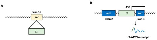 The insertion of L1 within or near oncogenes or tumor suppressor genes can contribute to tumor development [,,,,,]. For example, telomerase reverse transcriptase (TERT) is one of the most commonly associated genes with L1 insertions [,]. Since aberrant TERT expression is associated with tumor development, L1 insertion near the TERT locus may play a role in carcinogenesis [,]. The somatic insertion of the L1 element was identified in exons 15 and 16 of the APC gene in colon and colorectal cancer, respectively (Figure 3A) [,]. The disruption of the APC gene, a tumor suppressor, can play a role in the constitutive activation of the Wnt/β-catenin pathway []. Germline L1 insertion in the mutated in colorectal cancers (MCC) gene was observed in the genomes of patients with HCC []. MCC is a β-catenin-interacting protein that can act as a potential tumor suppressor by inhibiting the Wnt/β-catenin pathway []. In some cases, the L1 insertion upregulates the expression of target genes. L1 insertion in the suppression of tumorigenicity 18 (ST18) gene, a transcriptional repressor, activates ST18 expression in several liver cancer cells [].