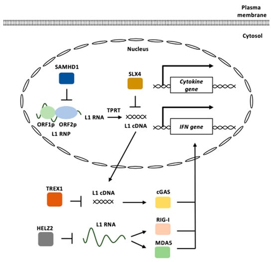 L1 contributes to autoimmunity through cGAS-, RIG-I-, and MDA5-mediated DNA/RNA sensing pathways (Figure 5) [,,]. The accumulation of cytosolic L1 cDNAs and RNAs is closely associated with dysregulated innate immunity, as described in this section. For example, TREX1 is an anti-viral DNase that prevents the accumulation of cytosolic DNAs and the subsequent type I IFN-associated inflammatory response [,]. TREX1-deficient neural precursor cells, neurons, and astrocytes exhibit an increase in intracellular DNA species, which correlates with neuronal toxicity []. L1 is a major source of accumulated DNA in TREX1-deficient neural cells []. Mutations in TREX1 have been found in patients with AGS, a disease that perturbs the innate immunity []. The inhibition of L1 reverse transcription leads to a reduction in extrachromosomal DNAs and rescues the associated neurotoxicity. Mutations in the SAMHD1 gene, which encodes a deoxynucleoside triphosphate triphosphohydrolase (dNTPase), have also been observed in patients with AGS [,,]. SAMHD1 acts as a potent cellular restriction factor against retroviruses, such as HIV and simian immunodeficiency virus, through its dNTPase activity [,]. However, the enzymatic active site mutant of SAMHD1 maintains substantial anti-L1 activity []. Instead, SAMHD1 inhibits ORF2p-mediated L1 reverse transcription in L1 RNPs by reducing ORF2p levels [].