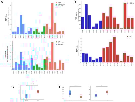 Training and testing dataset summaries. (A) Cohort 1, training dataset, productive TCR-α and TCR-β sequence counts for each individual. Red indicates patients with CeD on gluten-containing diets, green indicates patients with CeD on gluten-free diets, and blue indicates controls. (B) Cohort 2, testing dataset, productive TCR-α and TCR-β sequence counts for each individual. Red indicates patients with CeD and blue indicates controls. (C) Boxplot showing significantly higher TRAV35 segment usage in patients with CeD compared to controls (adjusted p = 0.0149, unadjusted p = 0.000338), difference below significance level of 0.05 indicated by *, in cohort 1, training dataset. (D) Boxplots showing significantly lower TRBV19 (adjusted p = 0.0340, unadjusted p = 0.000724) and higher TRBJ2-3 (adjusted p = 0.0422, unadjusted p = 0.00325) segment usage in patients with CeD compared to controls, difference below significance level of 0.05 indicated by *, in cohort 1, training dataset. In (C,D), patients with CeD on gluten-containing diets and patients with CeD on gluten-free diets were both included in the CeD group as no significant differences were observed between the two subgroups.