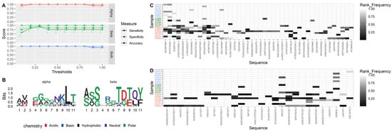 Cohort 1, training dataset. (A) Sensitivity, specificity, and accuracy obtained at varying thresholds of ranked-frequency for TCR-α, TCR-β, and both TCR-α and TCR-β in cohort 1, training dataset. (B) Logo plots of the sequences TCR-α (left) and TCR-β (right) sequences of length 11 that are included in the model. Logo plots for sequences of all length are included in the Supplementary Figures S7 and S8. (C) Heatmap showing ranked-frequency for the sequences included in the TCR-α model with a threshold of 0.6 ranked-frequency, and (D) heatmap showing ranked-frequency for the sequences included in the TCR-β model with a threshold of 0.2 ranked-frequency. Red labels indicate patients with CeD on gluten-containing diets, green labels indicate patients with CeD on gluten-free diets, and blue labels indicate controls. Light colours represent absence of the sequence in that individual, whilst dark colours represent the presence of the sequence at high ranked-frequency.