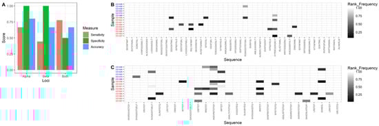 Cohort 2: testing dataset. (A) Sensitivity, specificity, and accuracy for TCR-α, TCR-β, and both TCR-α and TCR-β combined for cohort 2, testing dataset. Optimal threshold and coeliac-predictive sequences determined using the training dataset were used. (B) Heatmap showing ranked-frequency for the sequences included in the TCR-α model, and (C) heatmap showing ranked-frequency for the sequences included in the TCR-β model. Red labels indicate patients with CeD, blue labels indicate controls. Light colours represent absence of the sequence in that individual, whilst dark colours represent the presence of the sequence at high ranked-frequency.