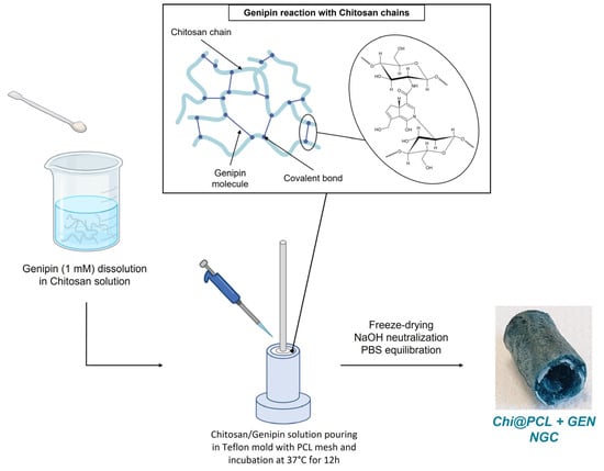 Genipin-crosslinked NCs (Chi@PCL + GEN) were fabricated according to our manufacturing technique described in [], with some modifications to the chitosan matrix reaction with the genipin molecule (Figure 1). Original Chi@PCL NCs without the addition of the genipin molecule within the polysaccharide solution were fabricated as control samples according to our fabrication protocols, using −80 °C as the freezing temperature.