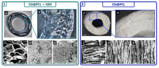 Nerve conduits morphology. (1) Optical microscopy of Chi@PCL + GEN NCs in cross-section displaying wall thickness porosity (a) with magnification of the sponge-like matrix (b). Scale bars are 1 mm. SEM images of NC porosity in the wall (c) and external (d) and internal (e) surfaces, respectively. Scale bars are 100 μm. (2) Optical microscopy of Chi@PCL NCs in cross-section displaying wall thickness porosity (a) with magnification of the sponge-like matrix (b). Scale bars are 1 mm. SEM images of NC porosity in the wall (c) and external (d) and internal (e) surfaces, respectively. Scale bars are 100 μm.