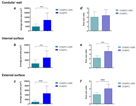 Conduits’ pore morphology analysis. Average pore area of Chi@PCL + GEN and Chi@PCL conduits calculated in the conduits’ wall (a) and internal (b) and external (c) surfaces, respectively. Pores shape expressed as pore axis ratio of Chi@PCL + GEN and Chi@PCL conduits calculated in the conduits’ wall (d) and internal (e) and external (f) surfaces, respectively. (*** = p < 0.0005).