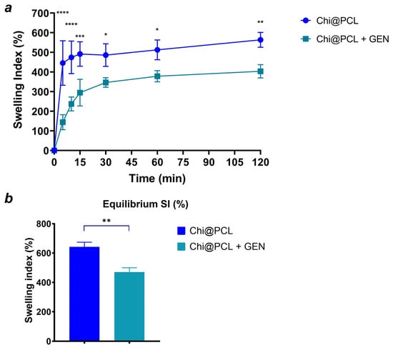 Nerve conduits’ water uptake kinetics. Time variation of swelling index (a) and equilibrium swelling index (b) for Chi@PCL + GEN and Chi@PCL NCs. (* = p < 0.05; ** = p < 0.01; *** = p < 0.0005; **** = p < 0.0001).