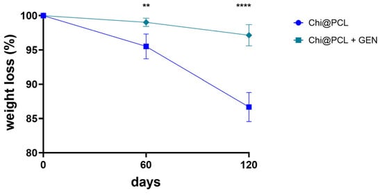 Both the genipin-crosslinked and original chitosan conduits exhibited a consistent water uptake kinetic due to the strong hydrophilicity of chitosan chains [,]. However, genipin-crosslinked NCs showed a slower hydration kinetic after 30 min of incubation in physiological conditions with respect to the original chitosan conduits (Figure 4a). Both the types of conduits reached equilibrium of water uptake after 72 h, with Chi@PCL + GEN NCs showing a significantly lower equilibrium SI in comparison to the original chitosan conduits (Figure 4b; p < 0.01). This result is due to the effect of genipin crosslinking, which reduced the overall porosity of the chitosan matrix and the amount of free amino groups of the chitosan chains, resulting in lower polymer chain hydrophilicity, a conditions that decreases water uptake [,]. We also performed in vitro degradation experiments of the genipin-crosslinked and original chitosan conduits by incubating our samples in a simulated physiological environment, as described in the Method Section. Figure 5 shows that genipin crosslinking significantly reduced the chitosan matrix degradation rate with respect to Chi@PCL NCs (p < 0.01 at t = 60 days; p < 0.0001 at t = 120 days), again due to the increased stability of the chitosan matrix guaranteed by covalent bonding with genipin. Another reason for the conduits’ slower degradation kinetic after crosslinking is the reduction of water uptake upon genipin crosslinking (Figure 4), which may decrease the amount of lysozyme penetrating the chitosan matrix during time, thus decreasing its degradation rate in simulated physiological environments [].