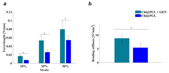 Conduits’ mechanical characterization. Compression resistance (a) and bending stiffness (b) tests of Chi@PCL + GEN and Chi@PCL NCs (* = p < 0.05).