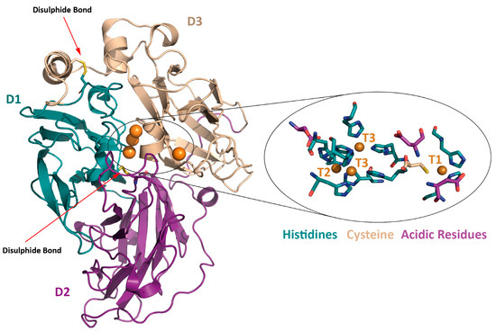 Fungal laccases are mostly extracellular glycoproteins of approximately 60–70 kDa with diverse carbohydrate moieties whose content typically varies from 10% to 25%, although higher saccharide contents have also been reported [12]. Alike other MCOs, they are typically monomeric enzymes whose polypeptide chain folds in three cupredoxin-type domains (D1, D2 and D3) formed by β-sheets arranged in a classical Greek-key barrel structure (Figure 1). Two conserved disulphide bridges stabilize the folding, connecting D1 with D2 and D1 with D3 [13,14]. The functional unit of fungal laccases includes four catalytic coppers covalently coordinated to the protein backbone by ten histidine residues and one cysteine residue [7].