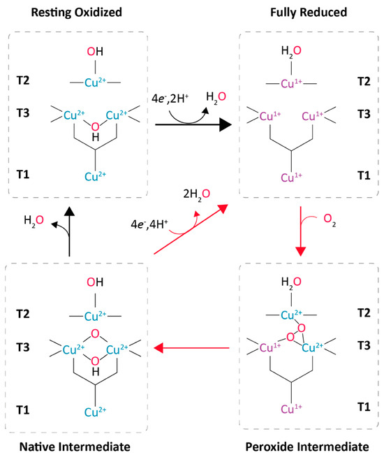 The O2 reduction mechanism has been studied as common to all MCO members. The catalytic cycle starts with the four catalytic coppers fully oxidized in a resting state. In this state, the T3 coppers are hydroxide-bridged, and the T2 copper is bonded with an external hydroxo ligand [17]. As substrate oxidation occurs at the T1 site, electrons are transferred internally until all four catalytic coppers are fully reduced, reaching the reduced stage (Figure 3). In the next catalytic step, the TNC reacts with O2, and the copper ions are oxidized two by two, in two consecutive steps. First, a peroxide intermediate is formed with two oxidized coppers (T2 and one T3). Next, the reductive cleavage of the O–O bond occurs via the transfer of two electrons from the remaining reduced coppers (one T3 and T1), assisted by proton donation from carboxylate residues near the TNC, to form the native intermediate. This state quickly reverts to the fully reduced form by the oxidation of four additional substrate molecules, while in the absence of more molecules of reductants, the native intermediate slowly decays to the resting oxidized form [17]. Three conserved acidic residues assist the catalysis. An aspartic acid inside the binding pocket (Asp205 according to PM1 laccase numbering, [15]) participates together with the His455 ligand in the concerted electron-proton transfer for the oxidation of phenols at the T1 site [26], while two conserved aspartates near the TNC (Asp77 and Asp453, PM1 laccase numbering) act as proton donors during the reductive cleavage of peroxide [17].