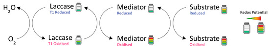 Fungal laccases exhibit a broad substrate spectrum. They catalyze the oxidation of several organic compounds like o- and p-substituted phenols and aryl amines, N-heterocycles, or different synthetic organic dyes [22,23,24]. These substrates undergo monovalent oxidation at the T1 site, and electrons are swiftly transferred via the His-Cys-His triad pathway to the TNC, where O2 is reduced to form two H2O molecules (Figure 2).