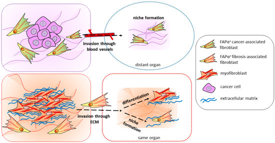 The mechanisms of fibrotic foci formation may be similar to those of tumor metastasis. Top: FAPα+ cancer-associated fibroblasts (CAFs) surround tumor cells, creating a favorable microenvironment for tumor growth. These cells are also capable of invasion through blood vessels into other organs. There, CAFs create a niche for tumor cell invasion, which leads to the formation of metastasis. Bottom: Similar to CAFs, FAPα+ fibrosis-associated cells (FAFs) surround the core of the fibrotic focus. Presumably, these cells are capable of direct invasion into healthy nearby tissues. In a new place, FAFs may give rise to a new focus both through the formation of a niche or differentiation into myofibroblasts—the main cells of the focus.