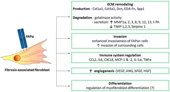 The data obtained for cancer-associated fibroblasts (CAFs) suggest that FAPα-positive fibroblasts have a specific secretory profile. In particular, these cells secrete significantly more cytokines (CCL2 and IL-6) and cell adhesion molecules (CXCL8) [89]. FAPα-positive decidual fibroblasts are characterized by high levels of expression of a number of chemokines (such as growth-related oncogene alpha, CCL2, and monocyte chemoattractant protein-2 (MCP-2)), proinflammatory cytokines (IL-1α and TNF-α), and positive regulators of angiogenesis (primarily vascular endothelial growth factor (VEGF), angiogenin (Ang), bFGF, and hepatocyte growth factor (HGF)) [90,91]. Thus, through paracrine activity, FAPα-positive fibroblasts can regulate not only invasion and migration but also the proliferation of other cells, as well as the inflammatory response. However, a detailed characterization of the secretome of FAPα-positive fibroblasts in fibrosis is currently absent.