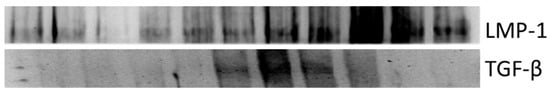 In this study, the presence of LMP-1 protein and TGF-β was also evaluated in the analyzed samples. The mineralization protein LMP-1 is an intracellular osteogenetic factor, which produces an increase in the expression of some osteoinductive factors including BMP-2, as well as promotes the expression of TGF-β. In all analyzed samples, the presence of LMP-1 was demonstrated (Figure 2); however, the protein TGF-β does not follow the same trend.