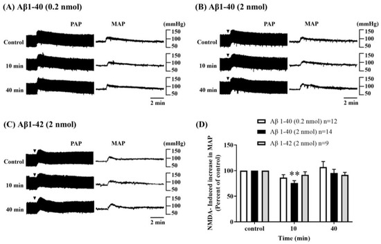 Effect of intracerebroventricular (i.c.v.) injection of amyloid-beta (Aβ) on NMDA receptor function in the RVLM. Representative recordings showed the effects of i.c.v. administration Aβ1-40 (0.2 nmol) (A), Aβ1-40 (2 nmol) (B), and Aβ1-42 (2 nmol) (C) on pulsatile arterial pressure (PAP) and mean arterial pressure (MAP) induced by microinjection of NMDA (0.14 nmol) into the RVLM every 30 min. (D) The bar graph shows the percentage changes in NMDA-induced increases in MAP 20 min before (control, i.e., 100%) and 10, 40 min after i.c.v. injection of Aβ1-40 (0.2 nmol, n = 12), (2 nmol, n = 14), and Aβ1-42 (2 nmol, n = 9). Values are mean + SEM. ** p ≤ 0.01 compared to the corresponding control analyzed using one-way ANOVA repeated measures followed by Bonferroni’s multiple comparison post-test.