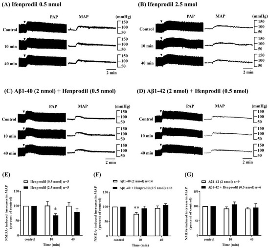 Effect of intracerebroventricular (i.c.v.) co-injection of amyloid-beta (Aβ) with ifenprodil, a GluN2B receptor antagonist, on NMDA receptor function in the RVLM. Representative recordings showed the effects of i.c.v. administration of ifenprodil alone at doses of 0.5 nmol (A) and 2.5 nmol (B), co-administration of ifenprodil with Aβ1-40 (C) and co-administration of ifenprodil with Aβ1-42 (D) on increases in pulsatile arterial pressure (PAP) and mean arterial pressure (MAP) induced by microinjection of NMDA (0.14 nmol) into the RVLM. NMDA was applied every 30 min. (E) The bar graph shows the percentage changes in NMDA-induced increases in MAP by i.c.v. injection of ifenprodil (0.5 nmol, n = 5 and 2.5 nmol, n = 5), (F) co-administration of Aβ1-40 (2 nmol) with ifenprodil (0.5 nmol), n = 6, and (G) co-administration of Aβ1-42 (2 nmol) with ifenprodil (0.5 nmol), n = 6, 20 min before (control, i.e., 100%) and 10, 40 min after application of NMDA. Values are mean + SEM. * p ≤ 0.05, and ** p ≤ 0.01 compared to the corresponding control analyzed using one-way ANOVA repeated measures followed by Bonferroni’s multiple comparison post-test.