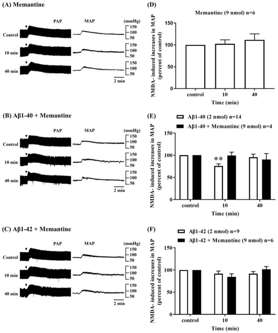 Memantine (9 nmol, n = 6) did not produce any noticeable changes in NMDA-induced pressor responses in the RVLM at 10 and 40 min after ICV administration (Figure 3A,D). However, the inhibitory effects of Aβ1-40 (2 nmol) on NMDA-induced pressor responses disappeared following co-administration of memantine with Aβ1-40 (n = 4) (Figure 3B,E). Similar to the effects of Aβ1-42 (2 nmol) alone, co-administration of memantine with Aβ1-42 did not show noticeable changes in NMDA-induced pressor responses in the RVLM (n = 6) (Figure 3C,F).