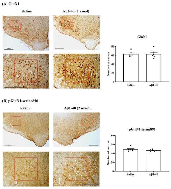 Phosphorylation has emerged as a mechanism regulating NMDA receptor functions. In the in vitro study, we examined the effects of Aβ on the expression of NMDA GluN1 subunits (GluN1) and phosphoserine 896 on the GluN1 subunit (pGluN1-serine896) in the RVLM neurons determined by immunohistochemical staining. Ten minutes after ICV administration of saline or Aβ1-40 (2 nmol), a comparison of the immunoreactive (IR) neurons of NMDA receptor subunit GluN1 in RVLM showed no significant difference between the two groups. The number of GluN1-IR neurons was 63.2 ± 2.4 (n = 6) in the saline-treated group and 63.2 ± 3.8 (n = 6) in the Aβ-treated group (Figure 4A). Similarly, there was no significant difference in the number of neurons in pGluN1-serine896-IR between saline and Aβ groups. The number of neurons in the former is 48.9 ± 1.8 (n = 6), and the number in the latter is 46.4 ± 0.8 (n = 6) (Figure 4B).
