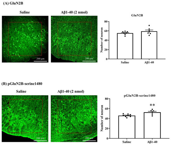 We examined the effects of Aβ on the expression of NMDA GluN2B subunits and phosphoserine 1480 on the GluN2B subunit (pGluN2B-serine1480) in the RVLM neurons determined using immunofluorescence (IF). ICV injection of Aβ1-40 (2 nmol) had little effect on the number of immunofluorescence (IF) neurons of GluN2B in the RVLM at 10 min following administration compared to saline. Aβ1-40 significantly increases the number of neurons of pGluN2B-serine1480 in the RVLM following administration (Figure 5A,B). The number of GluN2B-IF neurons was 55.2 ± 1.4 (n = 7) in the saline-treated group and 59.2 ± 2.7 (n = 7) in the Aβ-treated group (Figure 5A). There was a significant difference in the number of neurons in pGluN2B-serine1480-IF between saline and Aβ groups. The number of neurons in the former is 45.9 ± 1.0 (n = 8), and the number in the latter is 52.6 ± 2.0 (n = 6) (Figure 5B).