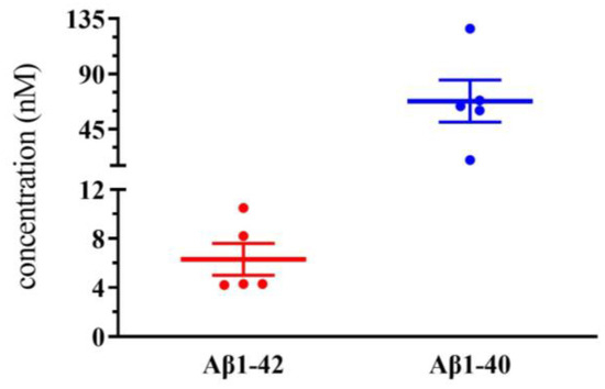 The graph shows the concentration of Aβ1-42 and Aβ1-40 in cerebrospinal fluid 10 min after intracerebroventricular injection of both peptides. Values are mean ± SEM. n = 5 for each group. There is a significant difference between the two groups analyzed using unpaired t-test.
