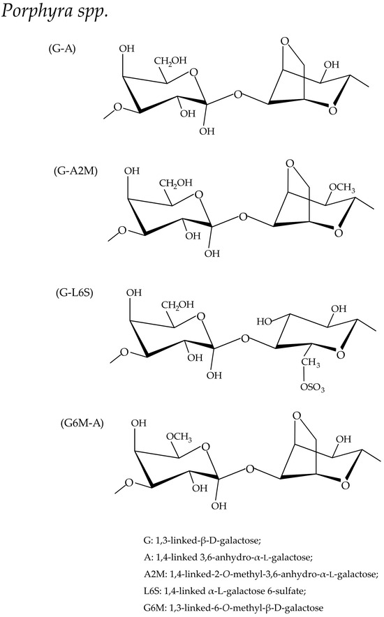 - Geng, L.; Wang, J.; Zhang, Z.; Yue, Y.; Zhang, Q. Structure and bioactivities of Porphyrans and oligoporphyrans. Curr. Pharm. Des. 2019, 25, 1163–1171. [Google Scholar] [CrossRef]