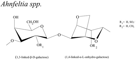 - Matsuhiro, B.; Barahona, T.; Encinas, M.V.; Mansilla, A.; Ortiz, J.A. Sulfation of agarose from subantarctic Ahnfeltia plicata (Ahnfeltiales, Rhodophyta): Studies of its antioxidant and anticoagulant properties in vitro and its copolymerization with acrylamide. J. Appl. Phycol. 2014, 26, 2011–2019. [Google Scholar] [CrossRef]