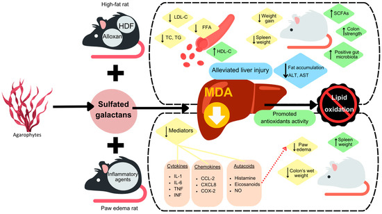 | Gracilaria lemaneiformis | Sulfated polysaccharides | High-fat-diet (HDF)-induced mice | Decrease serum TC 1, TG 2, and free fatty acid levels; lowered serum alanine aminotransferase and aspartate aminotransferase; controlled body weight and alleviated liver injury by decreasing serum alanine upregulating the expression of the PPARα 3, ACS 4, and CPT1a 5 gene | [34] |