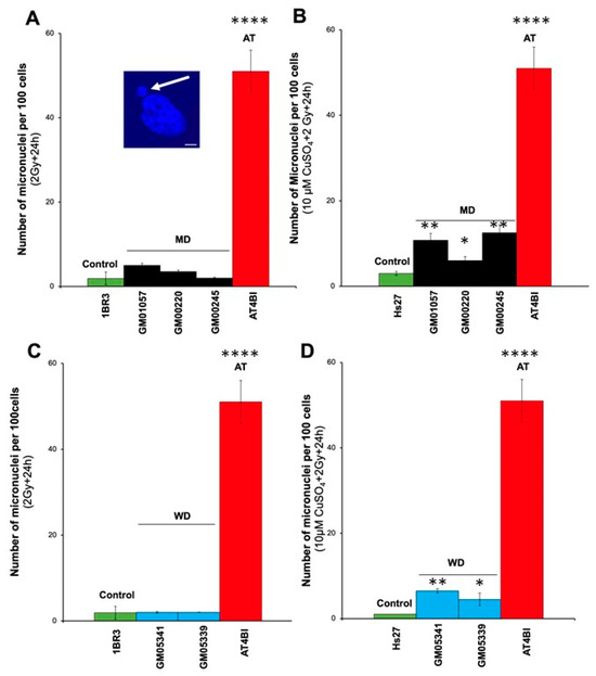 3.2. Abnormally High Levels of Micronuclei in MD and WD Fibroblasts