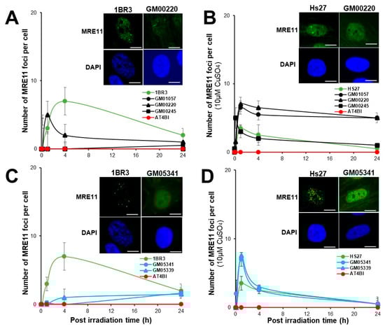 | Number of MRE11 foci | Lower than controls. Early MRE11 foci after Cu pre-treatment | Lower than controls. Early and late MRE11 foci after Cu pre-treatment |