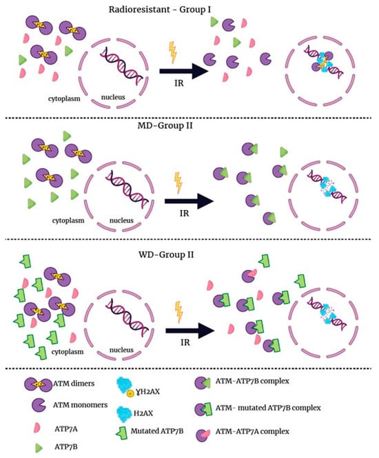 - a systematic delayed RIANS with cytoplasmic complexation between ATM and ATP7B (for MD cells) or between ATM and both ATP7B and ATP7A (for WD cells).